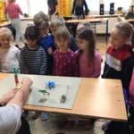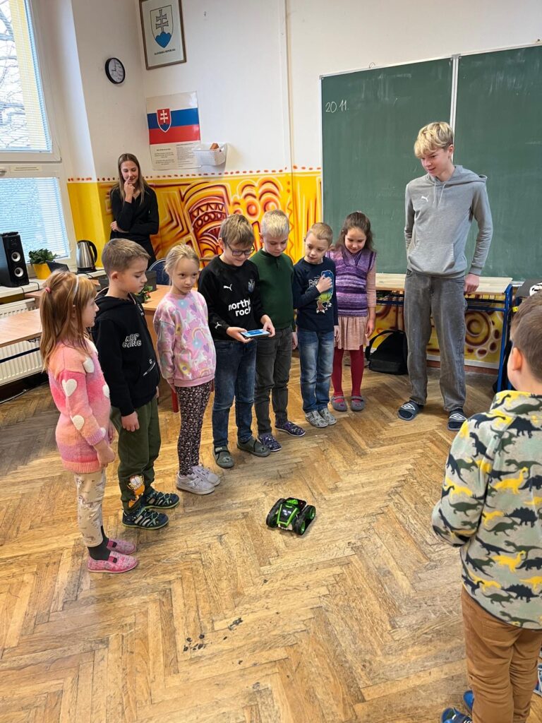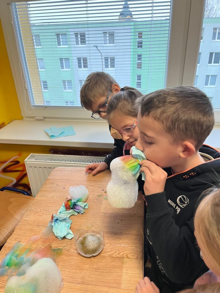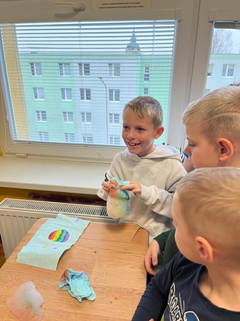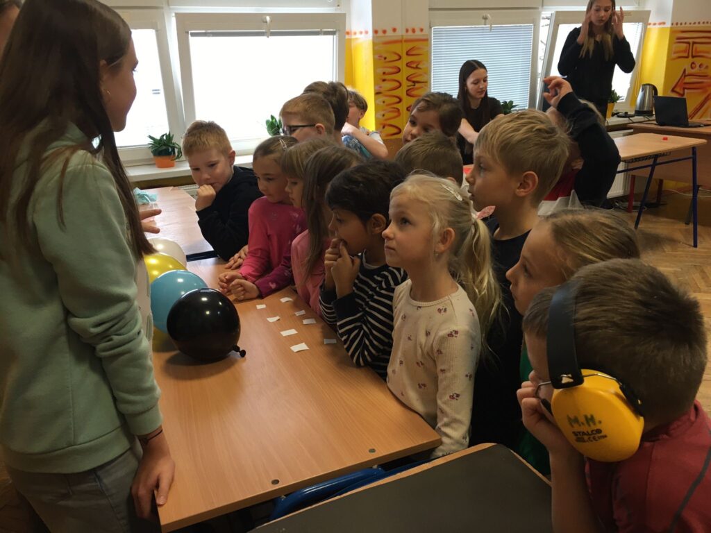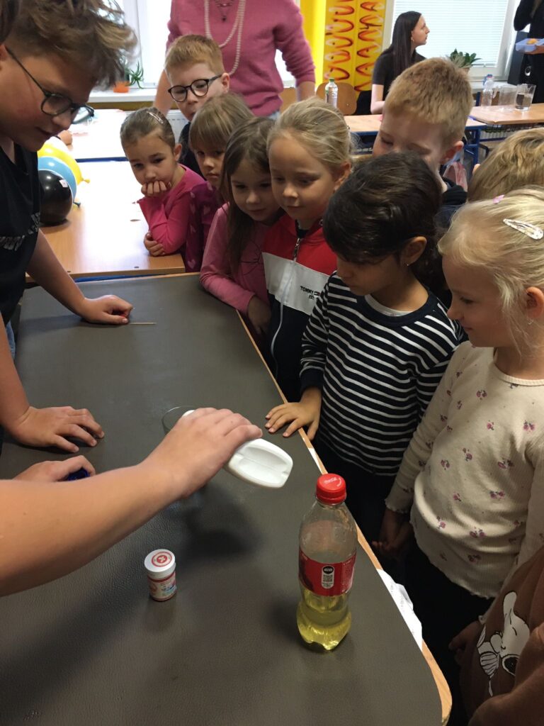 V utorok zažili žiaci prvého ročníka mimoriadne zaujímavé dopoludnie. Žiaci 8. A triedy pod vedením učiteľky Mgr. B. Stopjakovej si pre nich pripravili sériu hravých a pútavých aktivít, vďaka ktorým mohli prváci nahliadnuť do fascinujúceho sveta fyziky. Starší žiaci sa ujali úloh malých pedagógov a prvákom vysvetľovali, skúšali a ukazovali rôzne pokusy. Žiaci mohli ovládať elektrické autíčko, overili si ako môže kvapalina prenášať silu pomocou hydraulického zariadenia. Prvákov nadchla aj modelová sopka, ktorá pred ich očami “vybuchla”, či farebná dúha z mydlovej vody, kde pochopili, ako sa svetlo láme a mieša. Veľký úspech mal aj pokus s potápačom, pri ktorom si deti odskúšali zmenu tlaku v praxi. O dobrú náladu sa postarala aj elektrostatika, pri ktorej balóny lietali, lepili sa a neposlúchali.