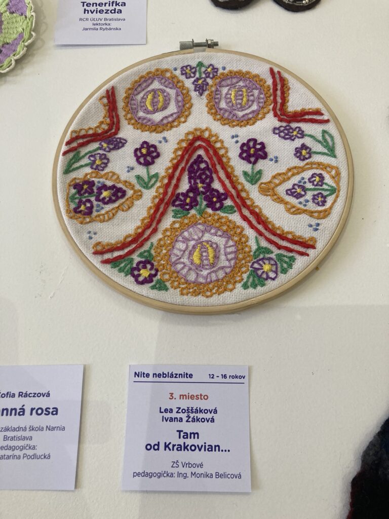 Dňa 20.6.2025 sa Lea Zoššáková a Ivana Žáková, žiačky 7.A triedy, zúčastnili pod vedením pani učiteľky M.Belicovej slávnostného odovzdávania ocenení v umeleckej súťaži V krajine remesiel 2025, ktoré sa uskutočnilo v Košiciach. Túto súťaž každé dva roky organizuje ÚĽUV v rôznych ľudovo-umeleckých kategóriách. Už pred dvoma rokmi sme v tejto súťaži zaznamenali úspech, keď sa náš bývalý žiak D. Víťazka umiestnil so svojou prácou v kategórii Nite nebláznite! na 3.mieste. Tento rok sme sme opäť obsadili v rovnomennej kategórii s prácou “Tam od Krakovian…” krásne 3.miesto. Dievčatá spoločne pracovali na výšivke inšpirovanej vzormi z ľudového odevu obce Krakovany.